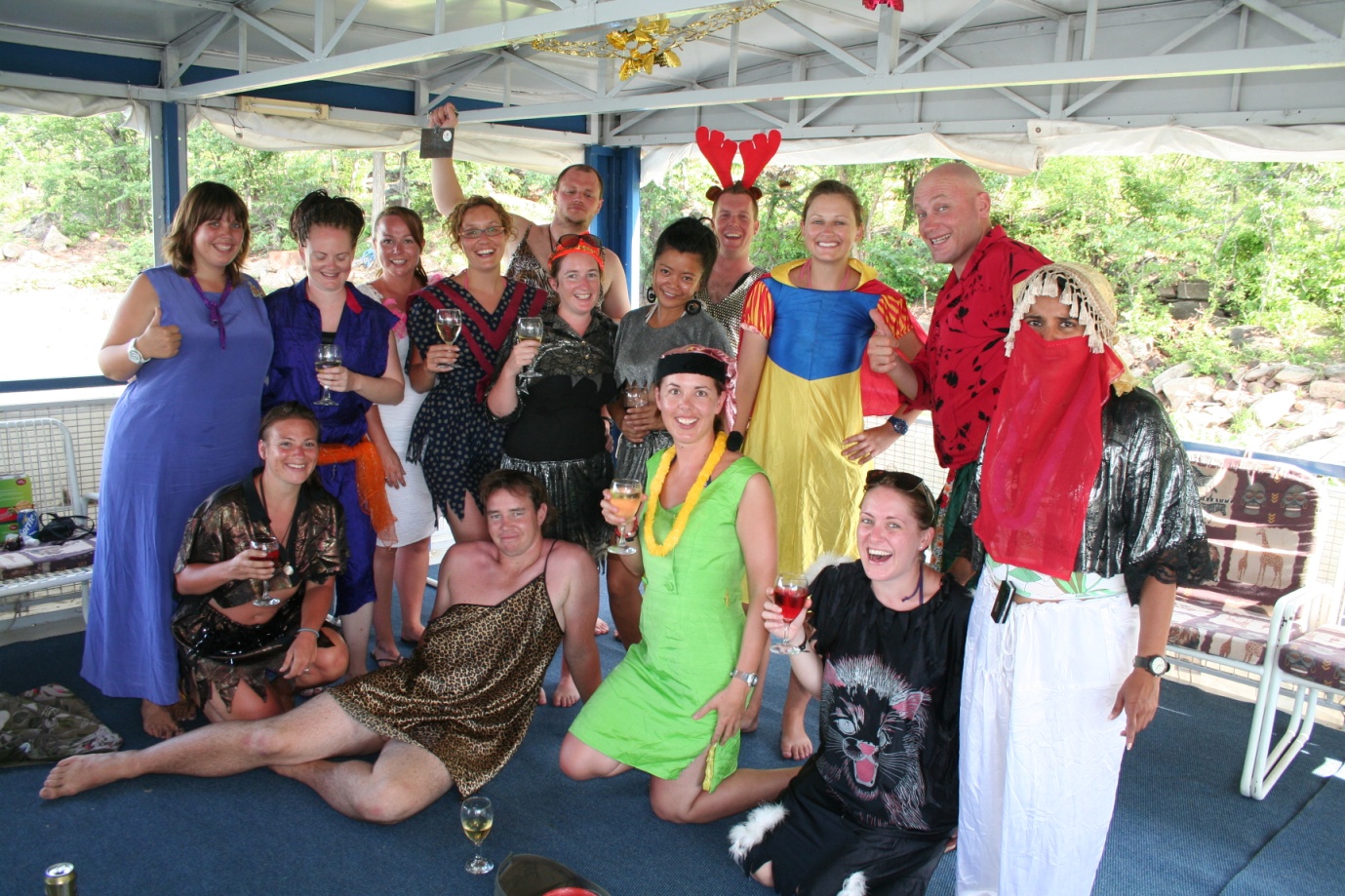 After our late Xmas lunch we get the opportunity for more fishing another game drive or just chilling around the pool. When I mean pool it is more of an oversized bathtub, but great for a dip during the heat of the day.   So some people caught fish,  some got chased by hippos during the game cruise and some hung out by the pool and watched a crocodile jump out of the water and snatch a stork from the shore.   All excitingly different from a “normal” Xmas day.    And if that was not enough, there were some more shenanigans around the pool when the water pistols and water bombs came out just before our late afternoon snacks.