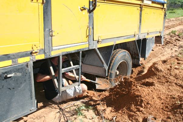 Did I ever mention that overlanding was an experience like no other? Have you heard of the term T.I.A.? This is Africa? Well sometimes in Africa things happen that are out of your control and we experienced that on the day we left the Bushman’s reservation. We got bogged! Not your average bog but a big fat African BOG! If you are going to do things, do them properly once or don’t do it at all. So we experience team work, t he coming together of people to achieve a common goal. So, we come together and dug Eeyore out of the sand and got her back on the road. Not without the help of about 20 Bushman, 20 kids and a few dogs. All in all it ended up being a good experience for the guys and gave a taste of what Overlanding used to be like several years ago.