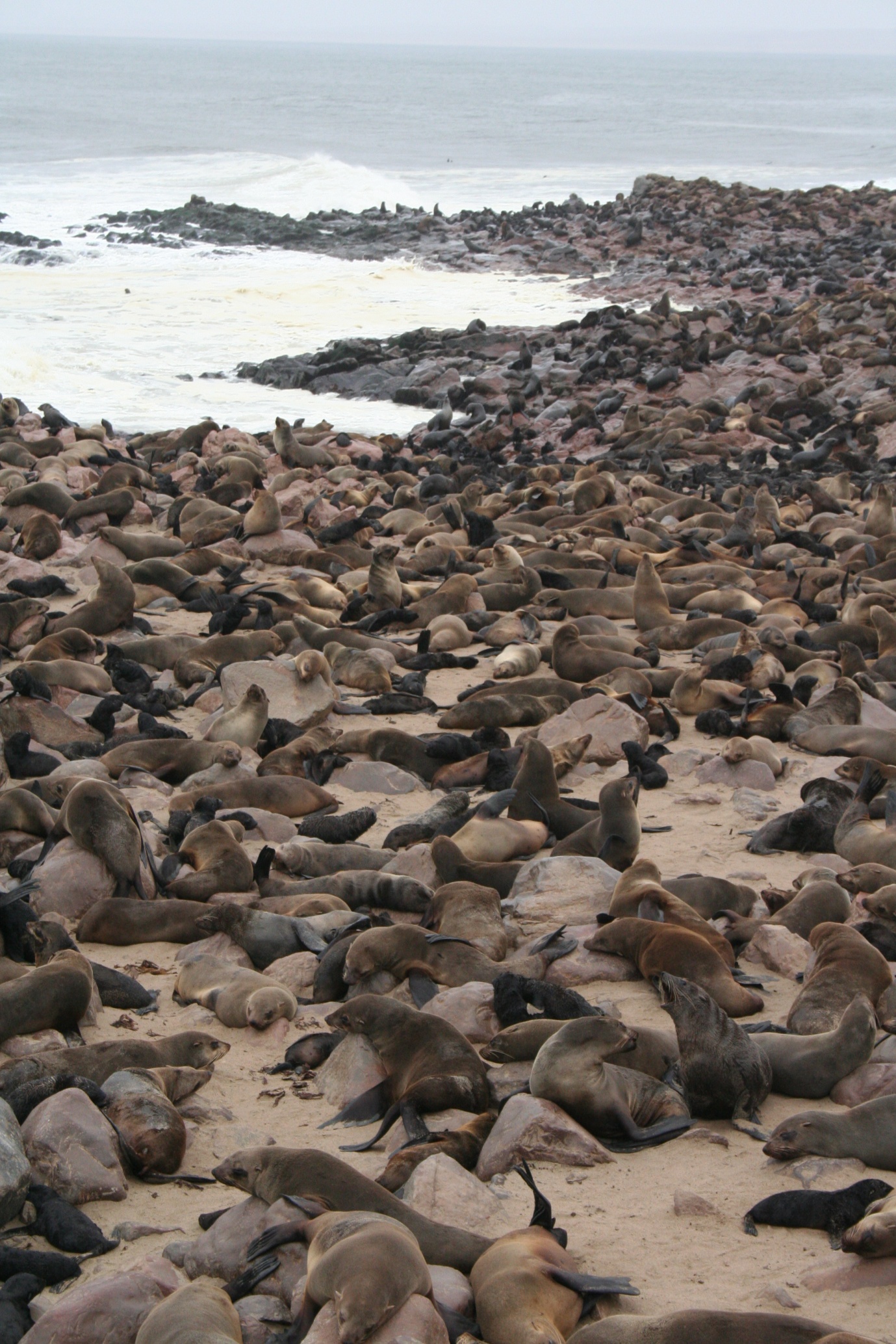 We make a sharp left turn on the salt road and head for the waves that we can see in the distance and before long find ourselves surrounded by 40 thousand Cape Fur Seals. There is nothing out here besides the waves of the Atlantic, salt flats, rocks and the smelly seals. This colony always resides at this spot along the coast and it is a guarantee that you will see seals. At this time of the year they have just given birth to pups and the shore is full of seal cows (as the females are known) and their pups. Some pups are only weeks old and we get a chorus of seal bleating from mothers trying to find their pups and pups trying to find their mothers. However impressive watching all these seals is we are forced to leave as the seals stink and there is only so much bad fish breath that one can take!