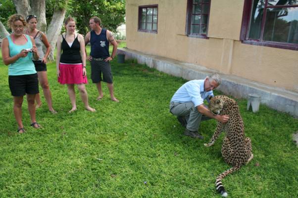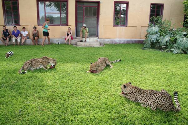 So let us get into the fun stuff, patting one of the three cheetahs that the properties owners have in their backyard, and get very close to these animals for outstanding photos. We listen to them purr and enjoy their interest in us with licking and rubbing. Then the cats get fed and it is time to leave them alone and let them eat in peace or. . risk get yourself a cheetah love bite!