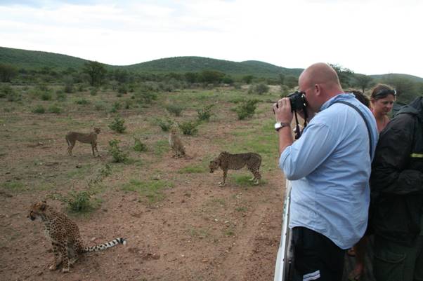 Some cheetah actually get very upset and fights can break out between them. It is a very exciting few minutes until the cheetah all get their food and run back into the cover of the vegetation and out of our view. There are no complaints from the guys about the afternoon. What else would you be doing on a Tuesday afternoon? Who thought you would be patting a cheetah.